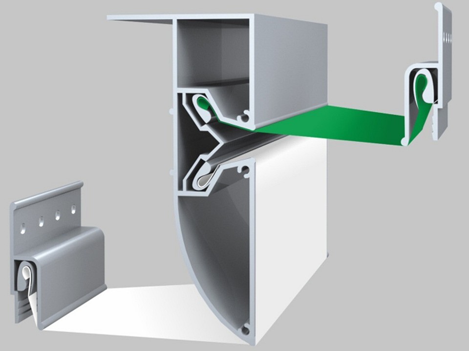 Бесщелевая система профилей позволяет использовать полотна различных цветов и фактур, без применения разделительной заглушки. В этом случае Вы получаете более идеальный и законченный вид потолка. Для монтажа используется специальный (заводской) бесщелевой профиль от компании Flexy: